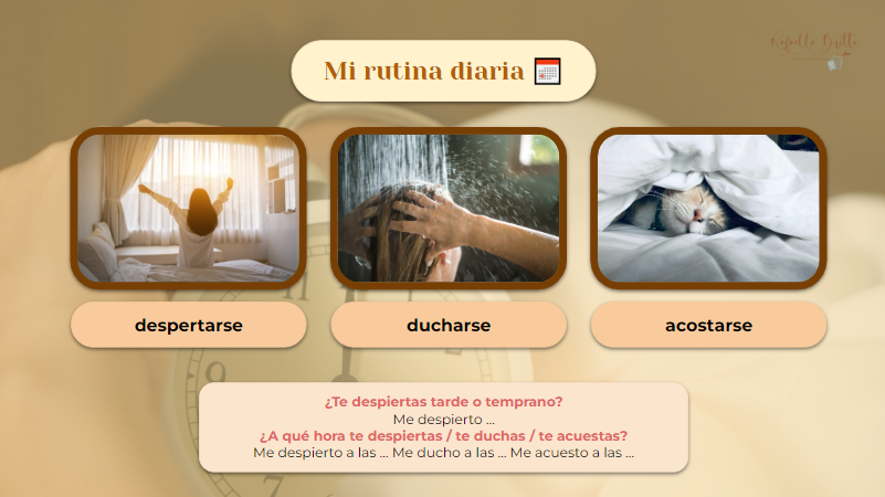 Un lección de nivel A1 para trabajar la rutina, las horas y los verbos reflexivos.